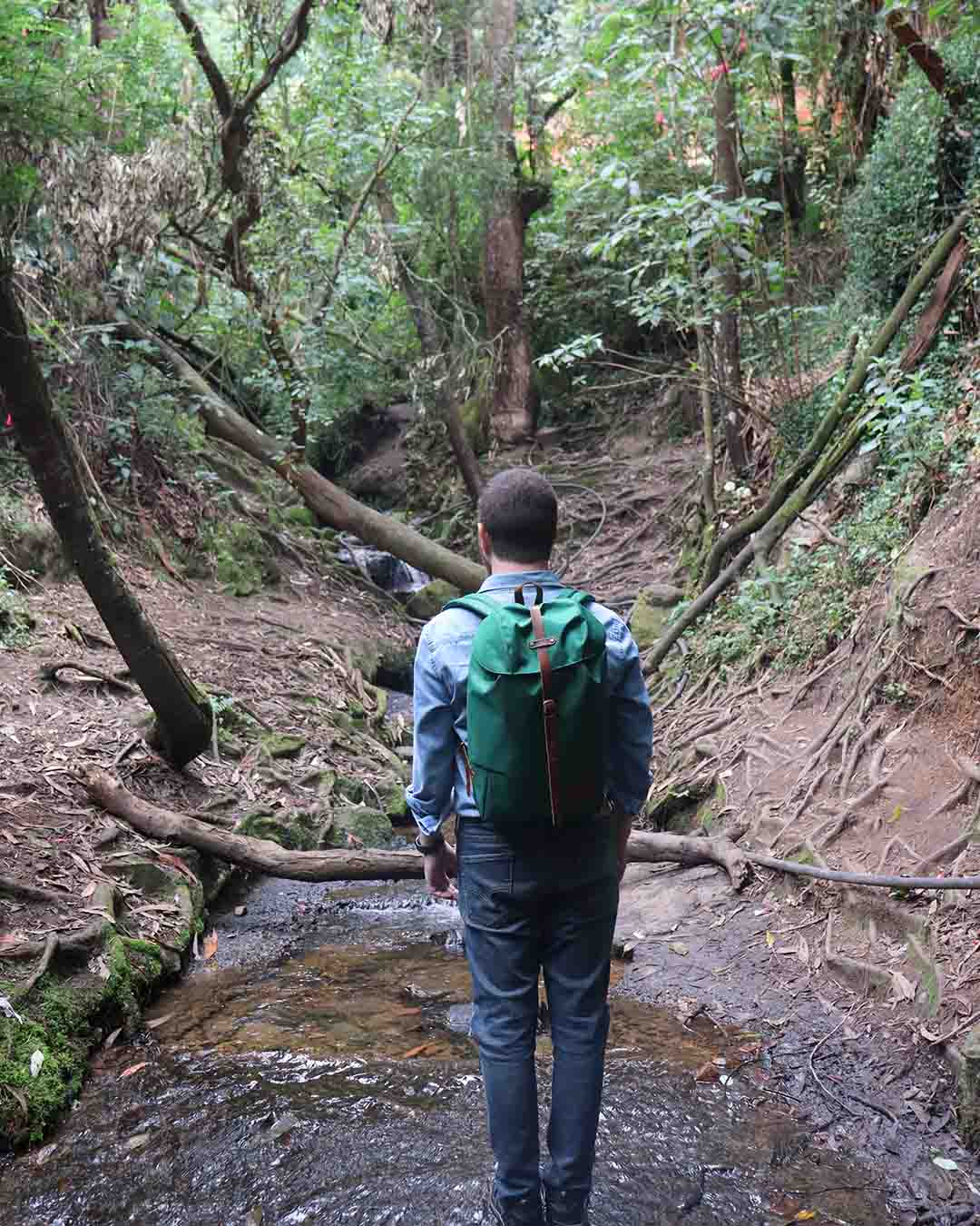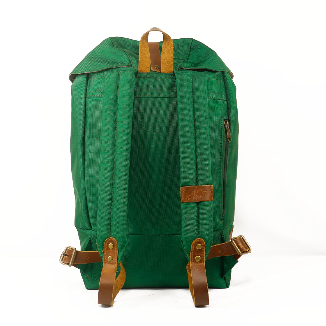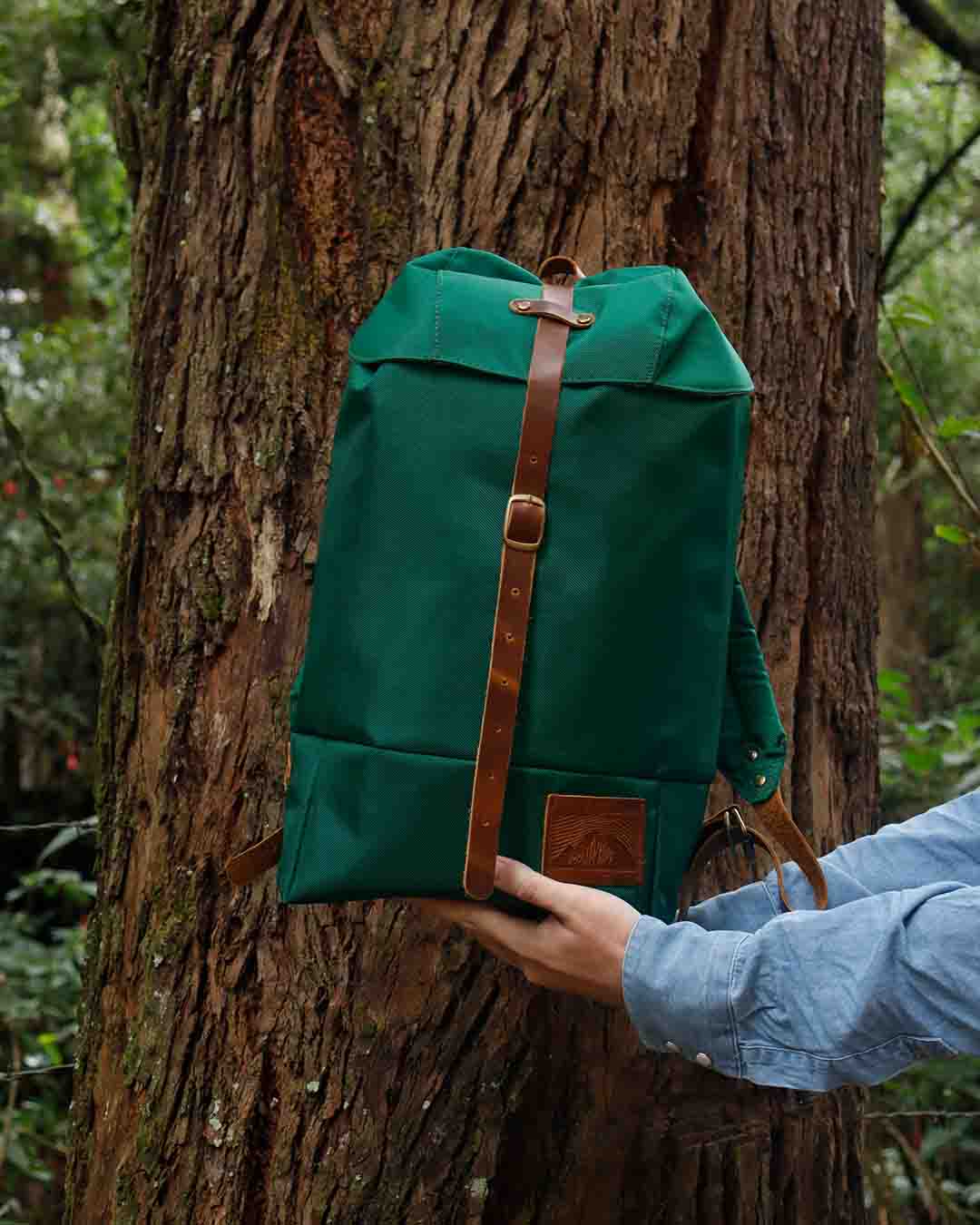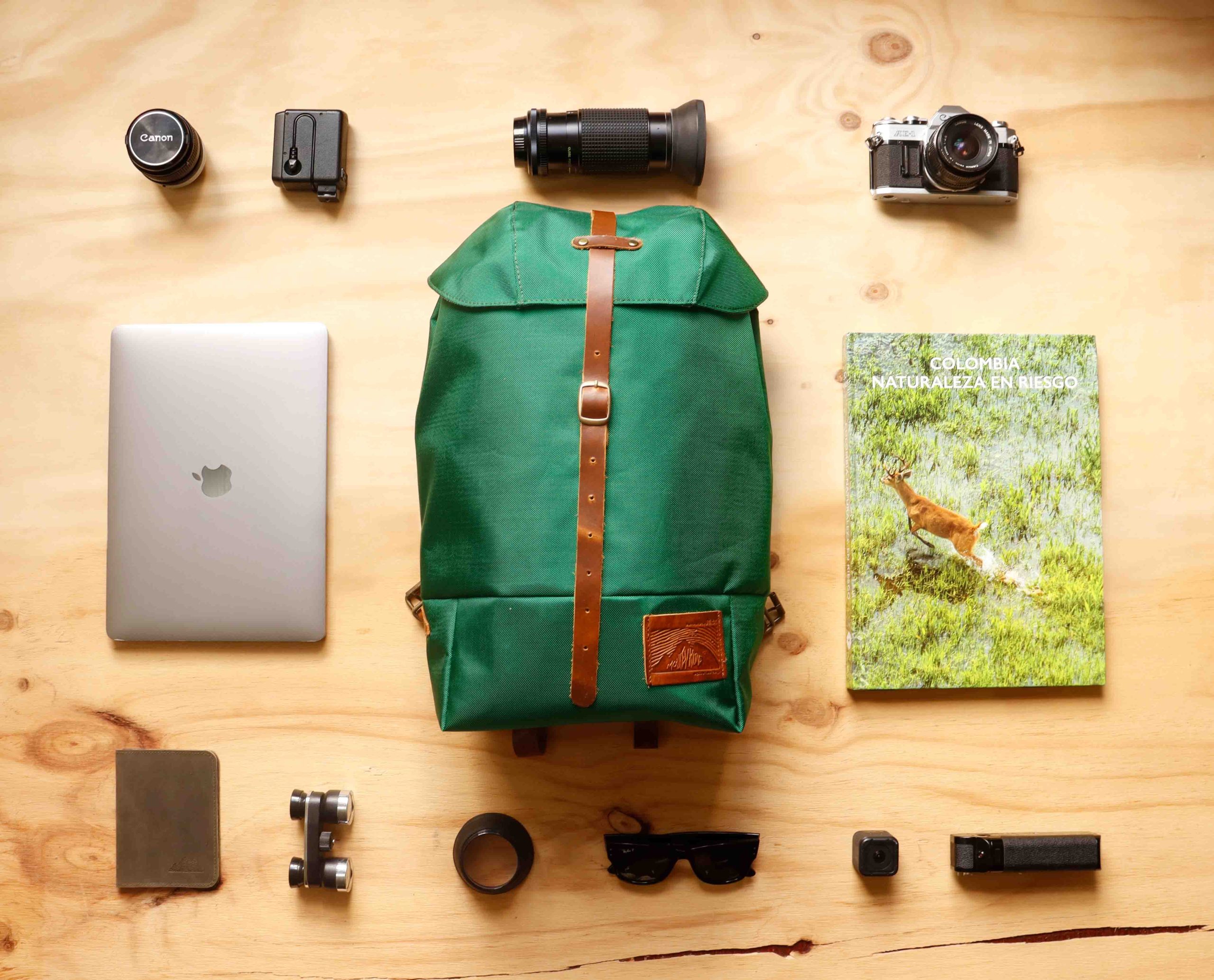 Materiales: Lona impermeable, 100% cuero, forro en lona antifluido, herrajes metálicos, cremallera de poliéster, cordón de algodón.