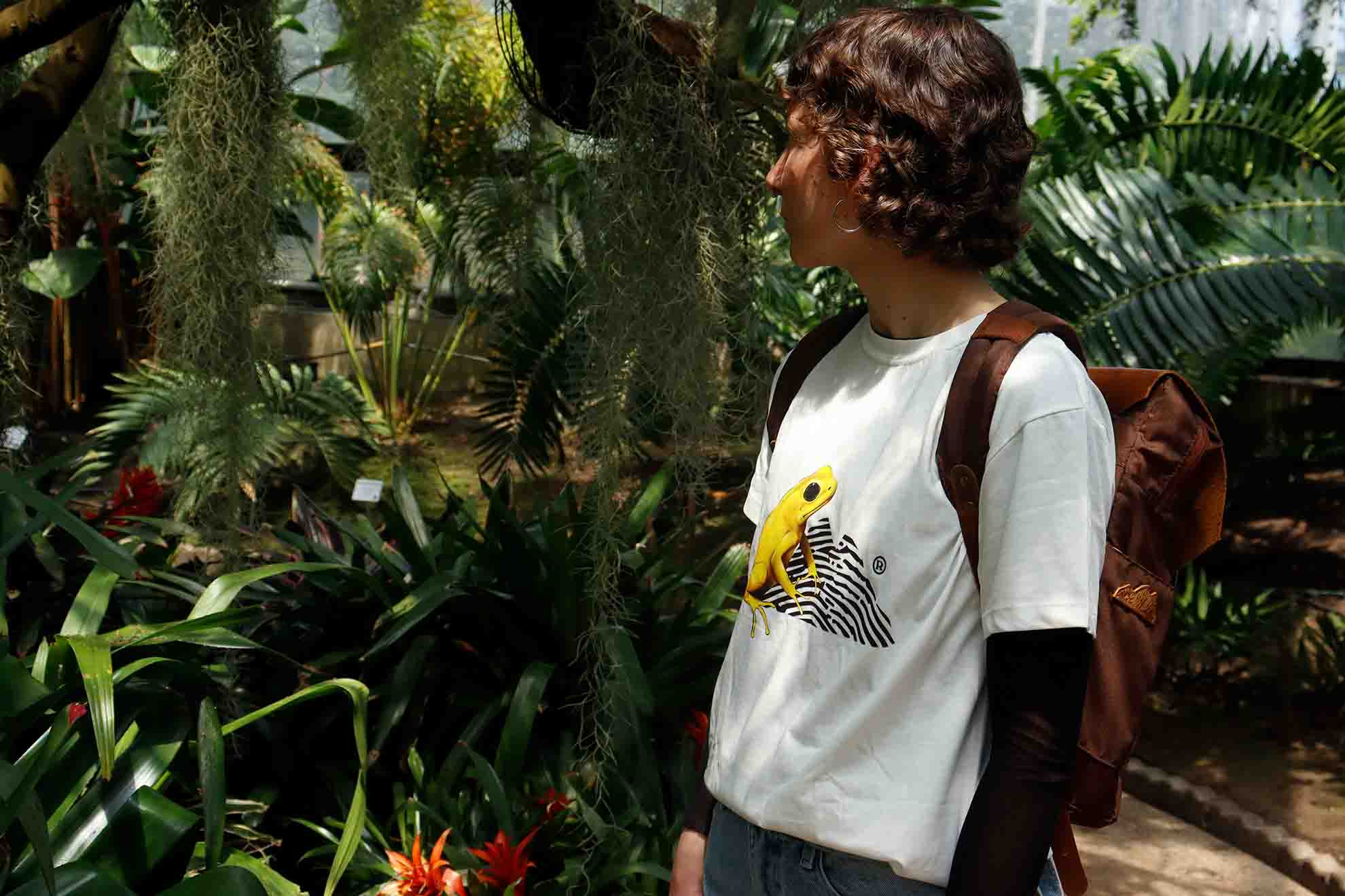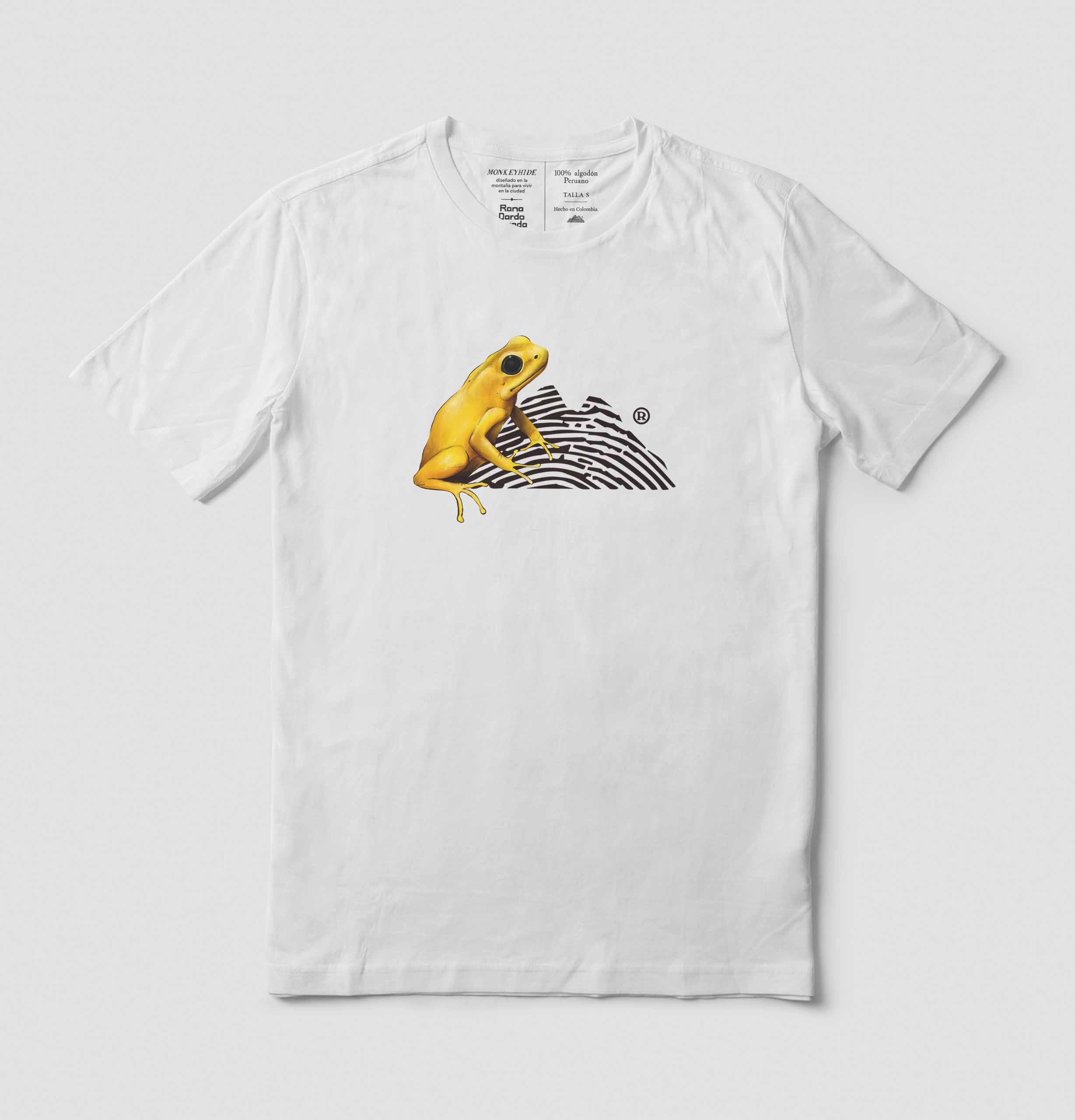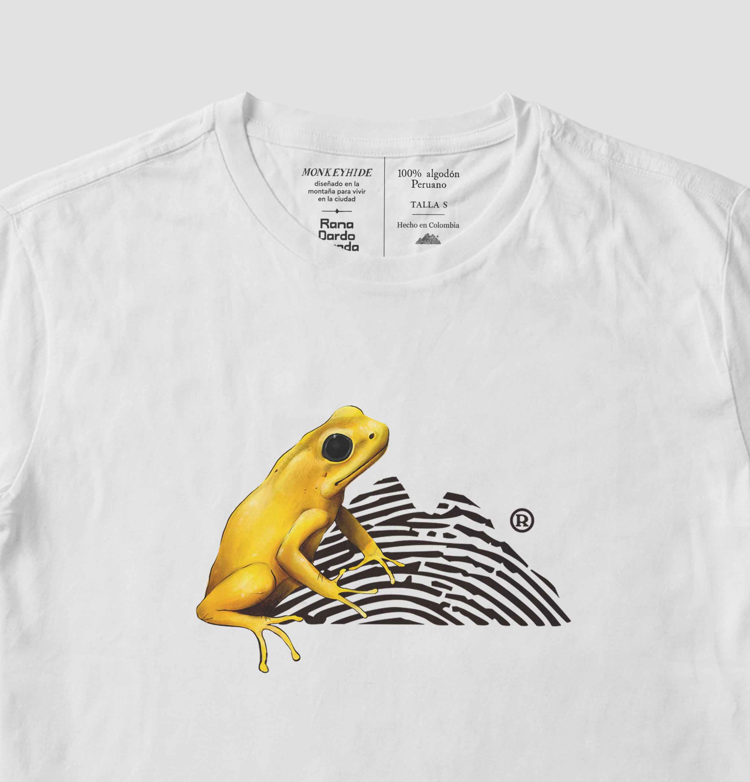 Camiseta 100% algodón peruano, estampada con el y montaña de la rana dardo dorada en la cara frontal.